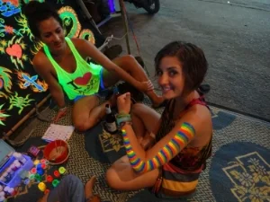 Leaving the room with our bug spray and party pants tied on tightly we were ready to jump in full force to experience one of the biggest parties in the world. Where was stop number one you might ask?... Getting black light painted. Skipping over the designs for a 7/11 logo (which are spread across Thailand infinitely ), sperm and dragons; we concluded with a simple but worthy stripe design down one arm.