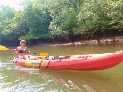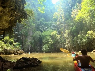 Our first full day spent in Krabi we went on a caveman kayaking tour. All of us wanted to be independent so we decided to jump into our own kayak, little did we know they were two person kayaks you just paddled solo. We cruised along the 'ma nam' (river) and ventured into many different caves the first of which was covered with over 100 drawings from anywhere between 3000 and 5000 yrs old. We also explored through the anaconda cave, named for its shape, and from there emerged into a green wonderland named 'The garden of Eden.' Named appropriately, this spot was my favorite and made me feel like I was in 'Jurassic Park' or 'Fern Gully.' Did I mention by this time Whitney and I had combined forces into one kayak? Oh and that we tied up to the back of Mike's kayak for a relaxing tow...